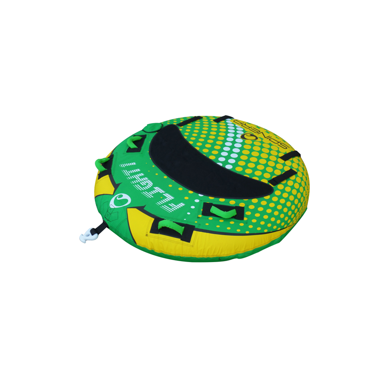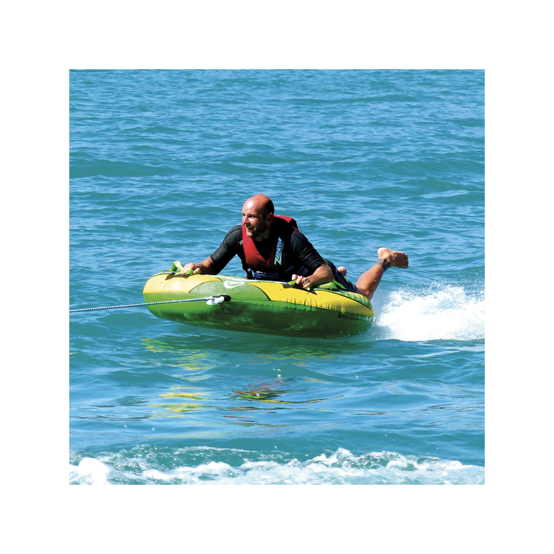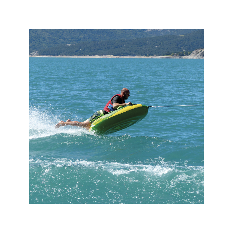 Fun et ludique, cette bouée tractée jaune et verte offre également aux utilisateurs une sécurité et une résistance garantit grâce à ses deux chambres à air assurant une double sécurité.