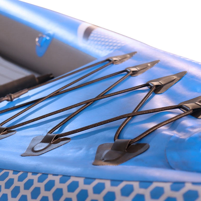 4 poignées de transport sont fixées aux extrémités et au milieu du kayak, pour des déplacements pratiques. Pour plus de résistance, elles sont en néoprène.