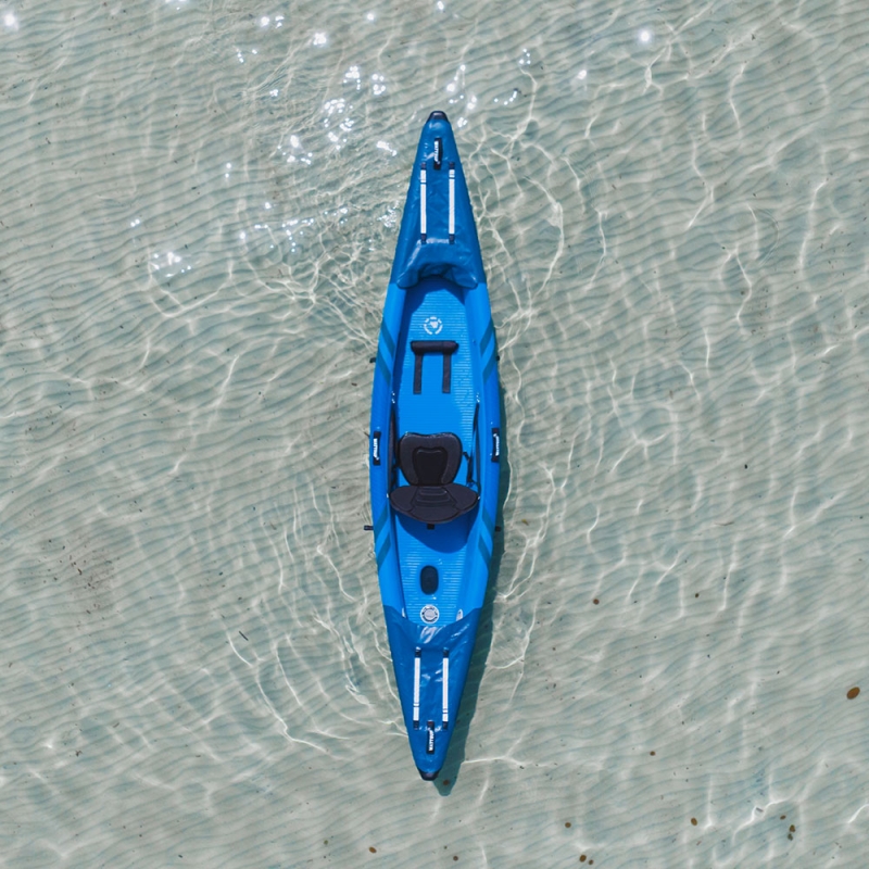 Construit en Dropstitch, le kayak Torpedo est à la fois léger, compact et rigide. Sa rigidité offre une glisse performante et sa forme en V permet de faciliter la prise de vitesse ainsi qu'une certaine stabilité, permettant de garder un grand contrôle de la trajectoire.
