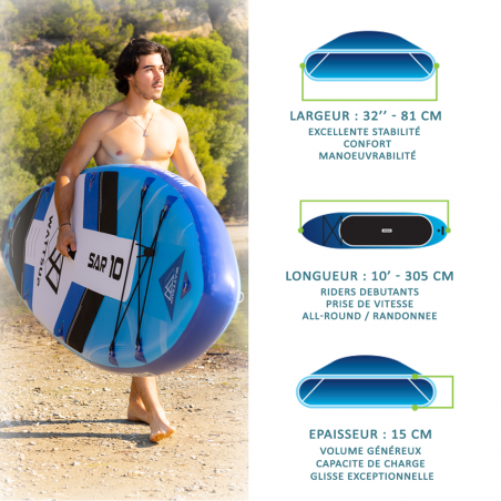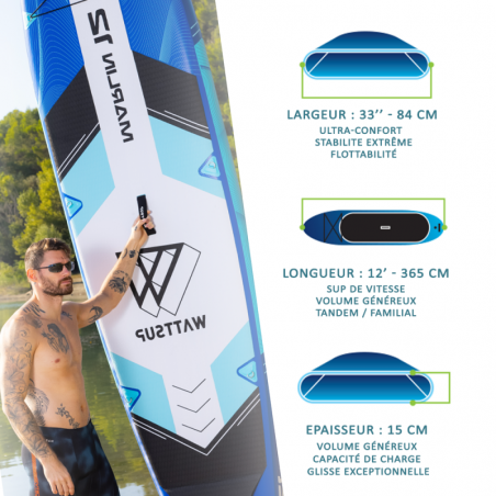 Extrêmement confortable et stable grâce à ses dimensions extra-larges (365x84x15cm), cette planche conviendra parfaitement aux gabarits plus lourds (150kg max), aux parents qui apprécient ramer avec leur enfant à l'avant ou aux duos. Son volume très imposant augmentera le contact avec la surface de l'eau, ce qui permettra aux riders de prendre de la vitesse pour plus de sensation.