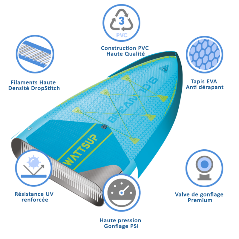 Wattsup met un accent particulier sur la densité des filaments utilisés dans ses planches. Grâce à cette nouvelle construction Drop Stitch, les planches gonflables SUP sont devenues plus légères et plus rigides.