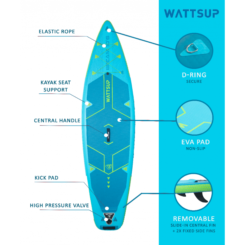 En plus d'un design unique et futuriste, les planches Wattsup sont également dotées d'un tapis EVA tout confort avec kick pad sur le tail de la planche. Cette partie surélevée à l'arrière du SUP vous offrira un point d'appui pour tourner facilement dans les vagues !