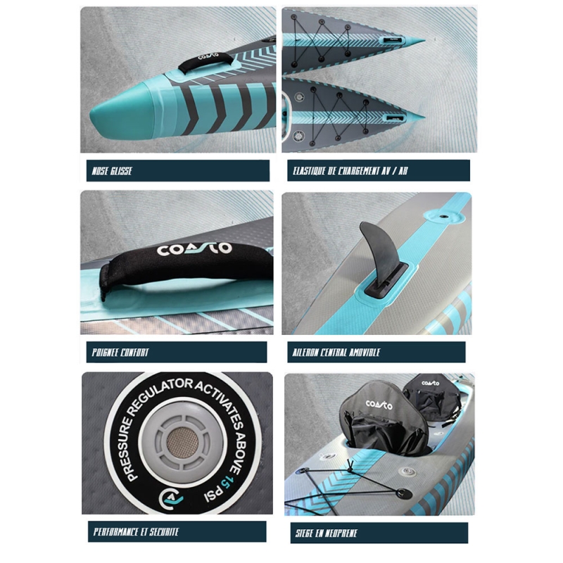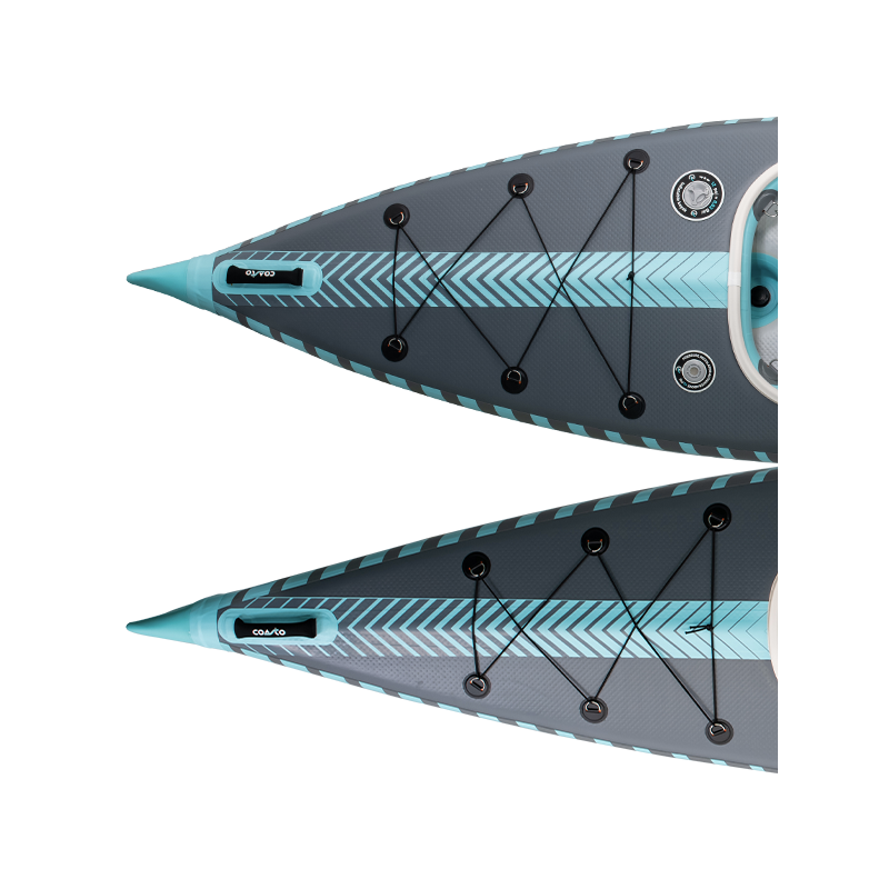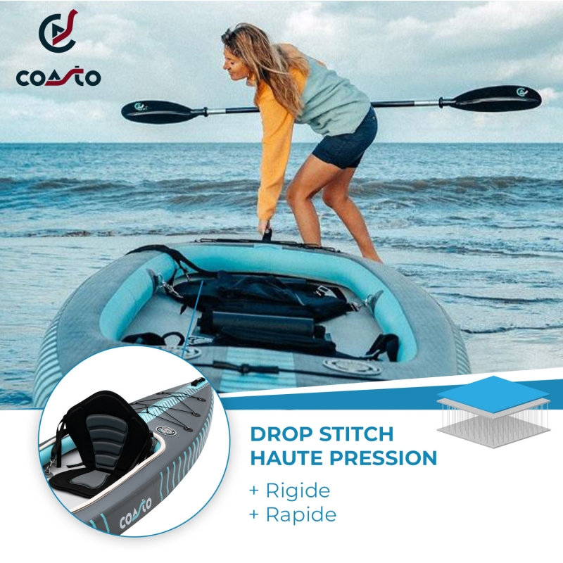 Le kayak gonflable Capitole 2 places développé par Coasto est un modèle disposant de la technologie Drop Stitch. Ce procédé de construction courant sur les paddles, octroie une rigidité accrue permettant de reproduire les performances techniques d'un kayak à coque rigide.
