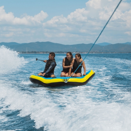 Les couleurs vives et la forme aérodynamique font de cette bouée tractée une vraie source de fun !