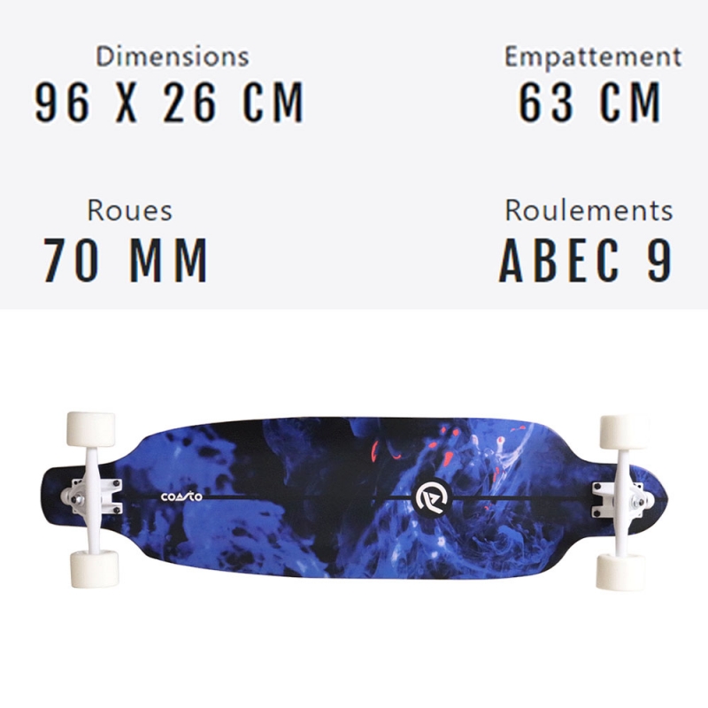 Les dimensions de la planche de l'AGAT 38" lui offrent une grand stabilité lors des sessions de freeride. Avec ses 96cm de longueur et 26cm de largeur, tous les gabarits de riders seront à l'aise sur le tout dernier longboard de COASTO.