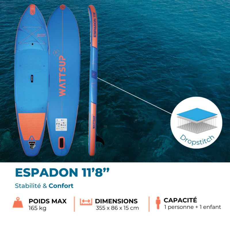 Caractéristiques PACK SUP GONFLABLE WATTSUP ESPADON 11'8" Reconditionné