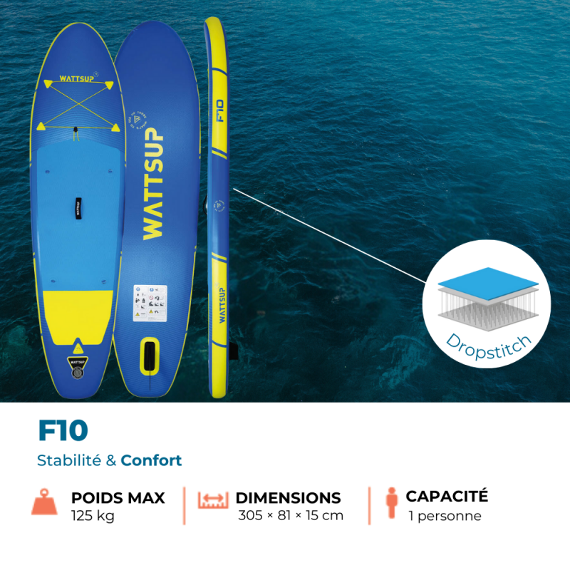 Technologies de nouvelle génération : La stabilité et la rigidité du F10 font de cette planche un modèle apprécié pour les longues balades, tandis que sa légèreté facilite vos déplacements, vous aidant à faire le meilleur choix pour vos aventures aquatiques.