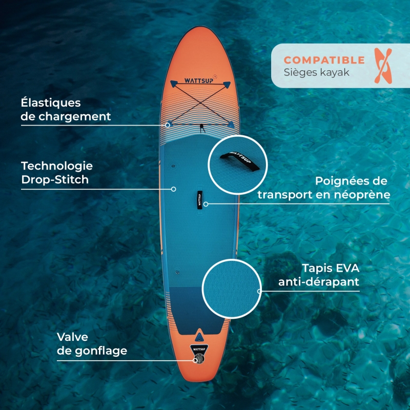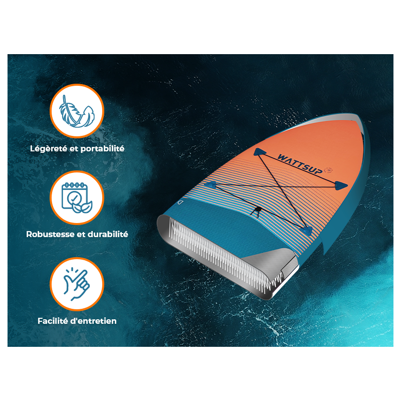 Wattsup met un accent particulier sur la densité des filaments utilisés dans ses planches. Grâce à cette nouvelle construction Drop Stitch, les planches gonflables SUP sont devenues plus légères et plus rigides.