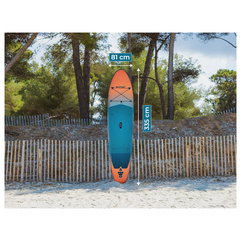 Le SUP F11 se distingue par ses dimensions généreuses (335 cm de long, 81 cm de large, 15 cm d'épaisseur) qui assurent une rigidité exceptionnelle et un volume optimisé. Ces caractéristiques garantissent une stabilité parfaite, idéale pour de longues sessions de touring ou pour naviguer sur de petites vagues.