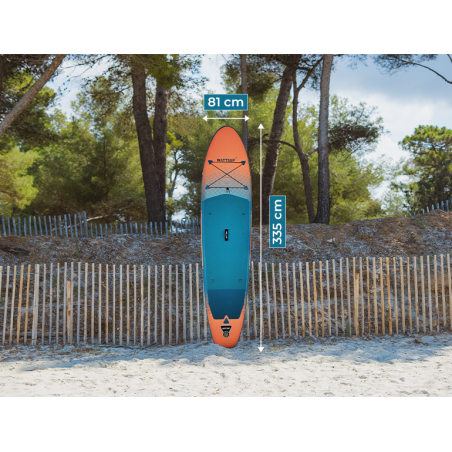 Avec une longueur de 335 cm et une largeur de 81 cm, le SUP F11 surpasse les modèles concurrents comme le Magma ou le Fusion de la marque Aquamarina. Sa construction robuste et son volume généreux vous garantissent une expérience de glisse fluide et agréable, que ce soit pour une courte sortie ou une longue randonnée.