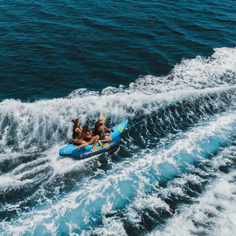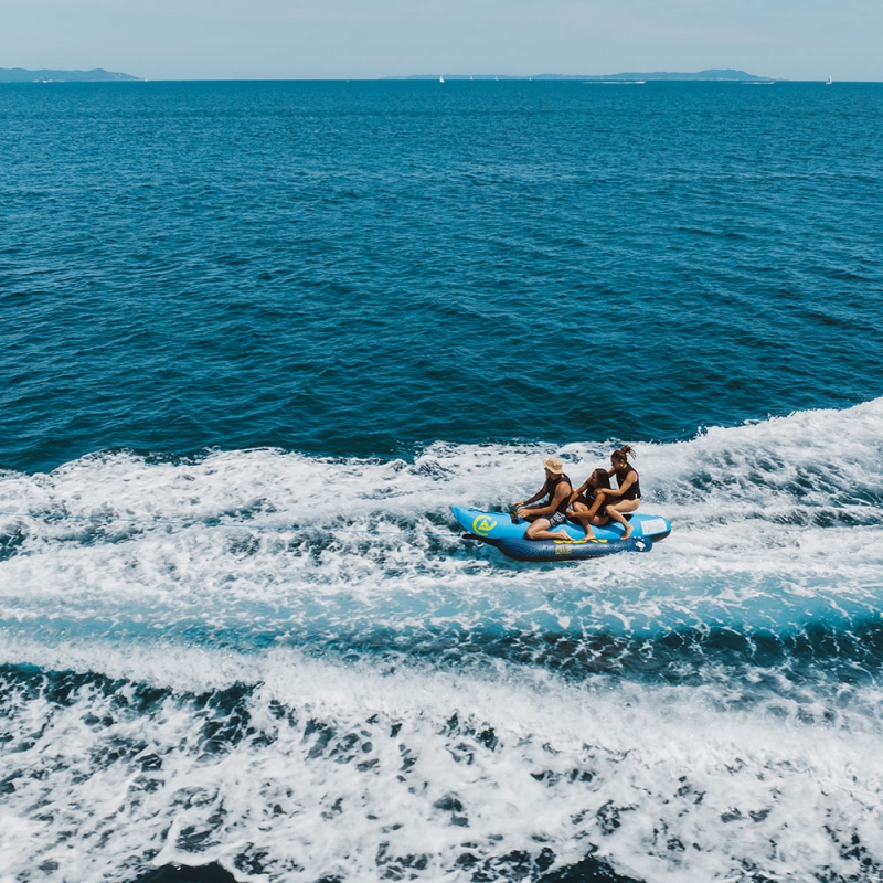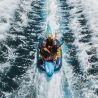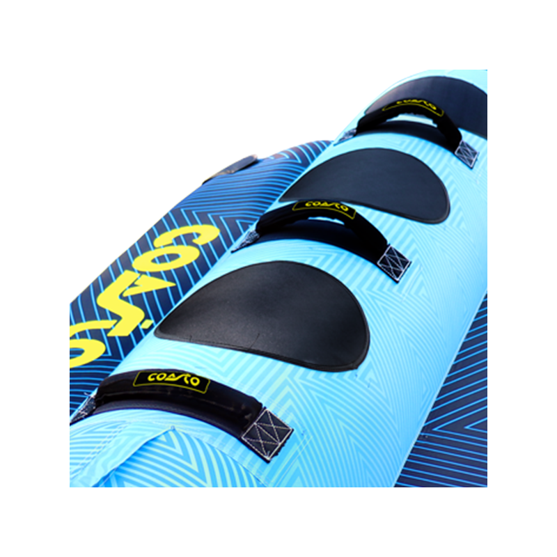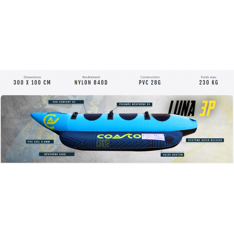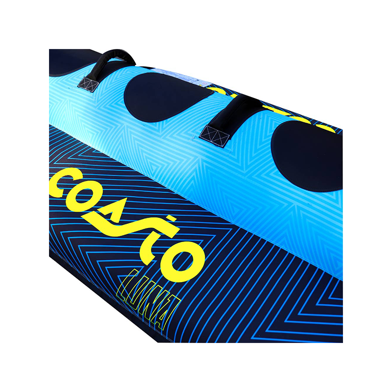 LUNA est une bouée banane 3 places, construite en PVC 28g (0.7mm d'épaisseur) avec un revêtement en Nylon 840D : cette conception lui octroie résistance et solidité inégalées.