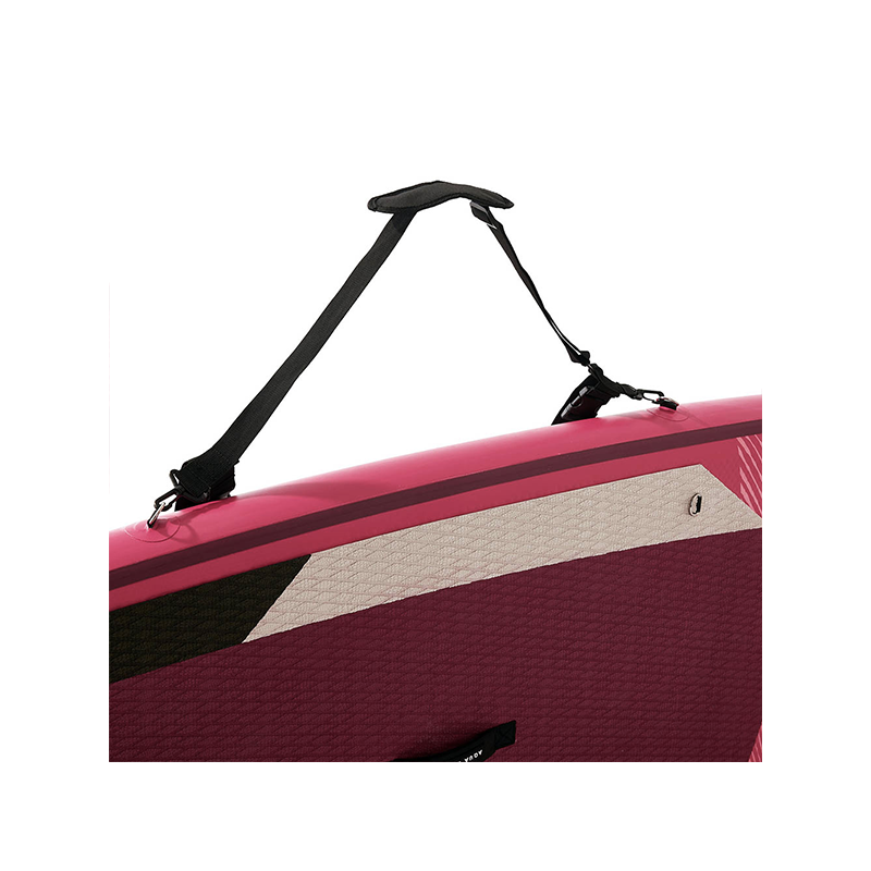 La poignée renforcée au niveau du centre du pad, permet de transporter facilement le paddle sans contrainte une fois gonflé, un accessoire supplémentaire est fournis pour le déplacer également avec l'épaule (voir image ci-dessous).