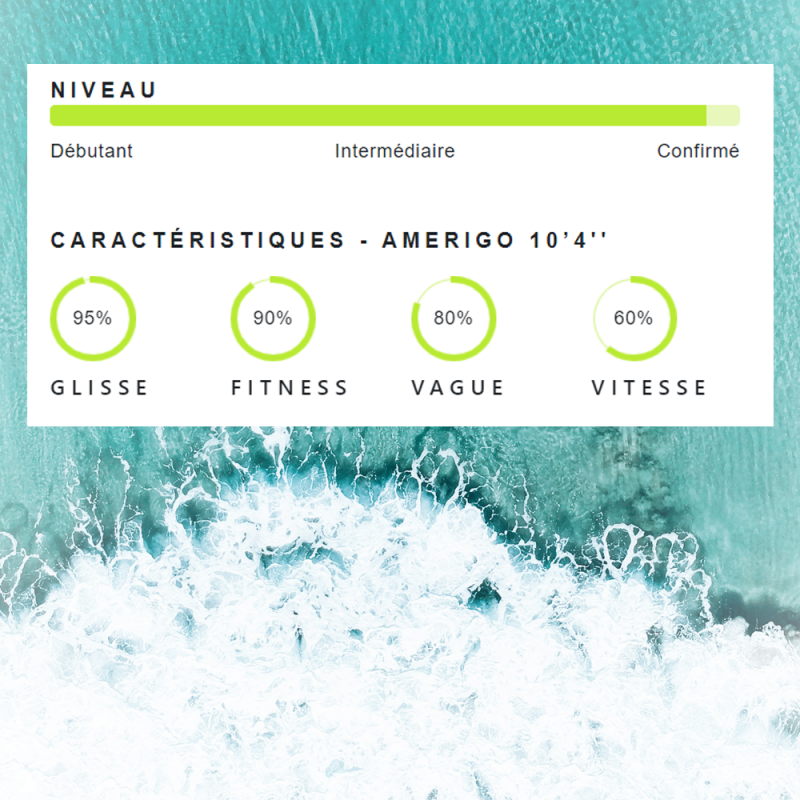 Le Coasto Amerigo 10'4" est un modèle optimisé pour les riders (charge maximale 125kg) de niveaux débutants ou intermédiaires qui souhaitent pratiquer et progresser du paddle avec une planche stable et solide dans le but de se balader et de progresser en SUP.