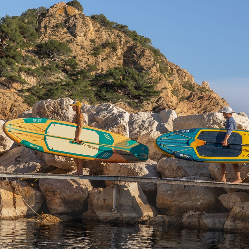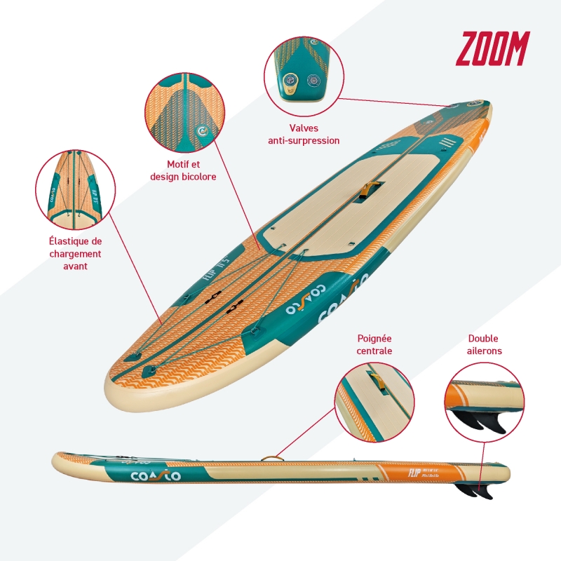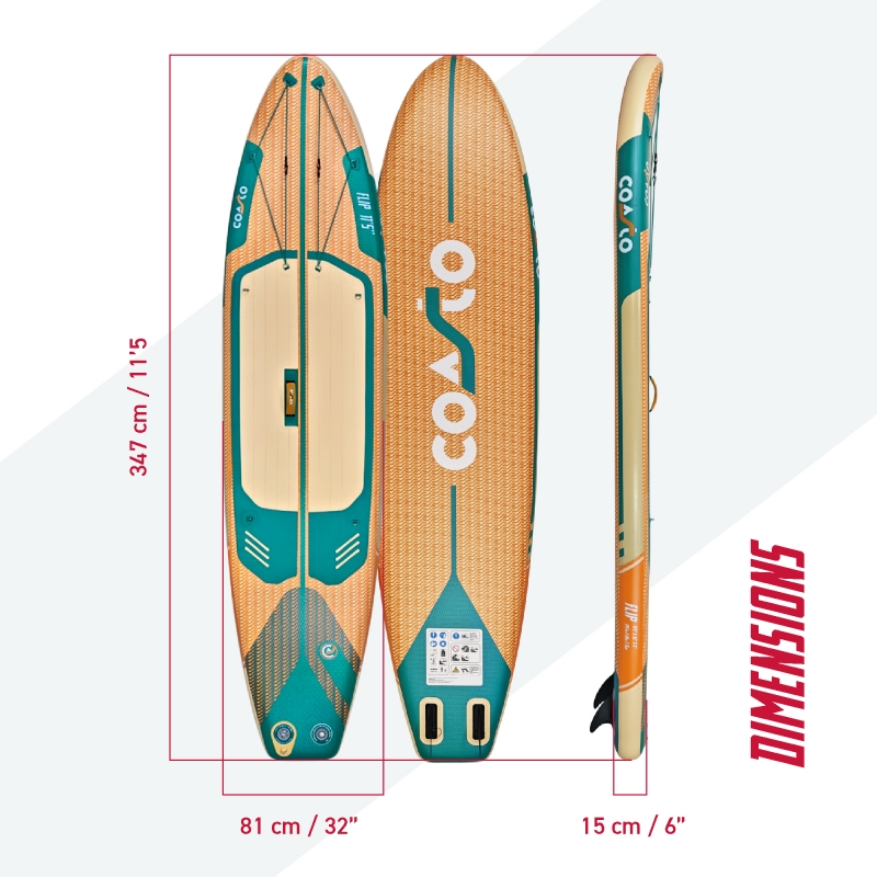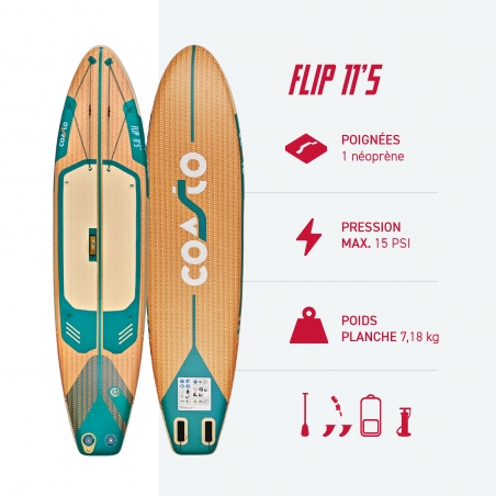 Le Coasto Flip 11'5 est la version grand format de la gamme Flip, conçue pour offrir plus de stabilité, de confort et de capacité sans perdre en praticité. Très accessible, il se distingue par sa facilité d’utilisation et son comportement rassurant sur l’eau, ce qui en fait un excellent choix pour les balades en famille ou les sorties avec du matériel. Son format généreux permet de naviguer en toute confiance, même chargé, tout en restant simple à transporter et à utiliser au quotidien. Si vous cherchez un SUP stable, polyvalent et adapté aux sorties partagées, le Flip 11'5 est une valeur sûre.