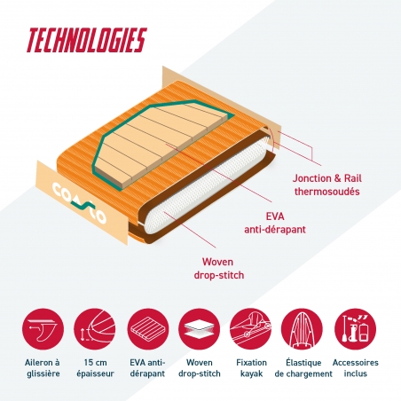 Rigidité Dropstitch Woven Une construction premium pour une planche ferme et réactive, avec des sensations proches d'un SUP rigide.