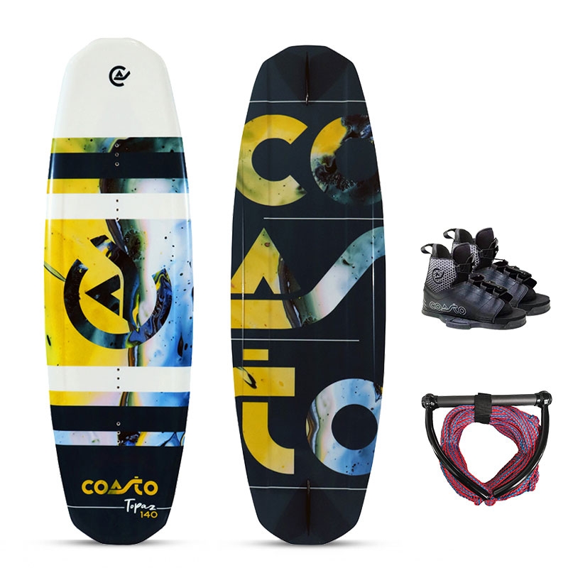 Avec 140 cm de longueur, le tout nouveau wakeboard de COASTO propose des dimensions intéressantes pour les riders au-delà d'1m65. Il conviendra tout aussi bien pour les cable parks ou pour être tracté par un bateau. Rocker 3 niveaux, chanels marqués, 2 ailerons... Le TOPAZ 140 à tout pour plaire à ceux qui souhaite s'initier à la pratique du wakeboard mais également aux riders avertis à la recherche d'une planche légère et maniable. Vendu avec les chausses taille unique et son palonnier, le Pack TOPAZ est parfait pour s'équiper simplement et rapidement